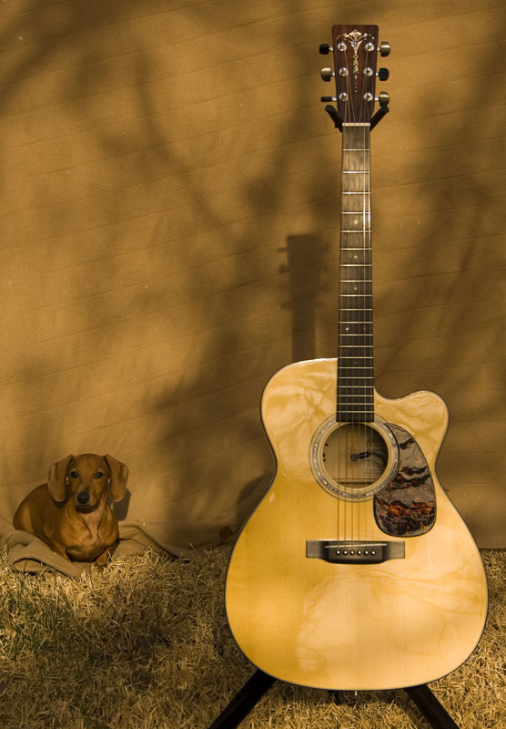 Petey, the dachshund puppy, joins the photo shoot. Petey likes Martin Guitars.