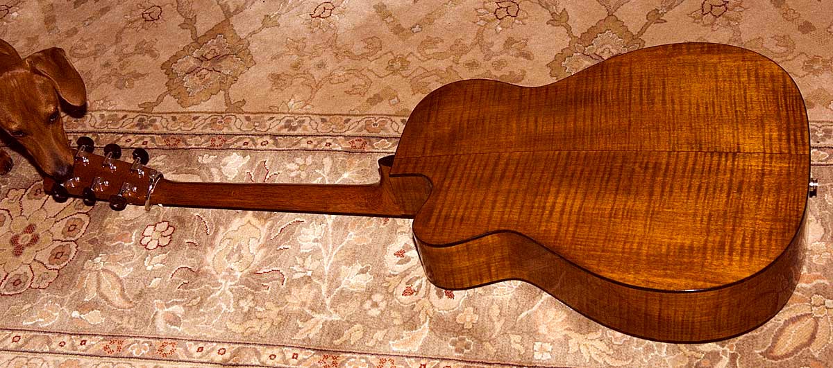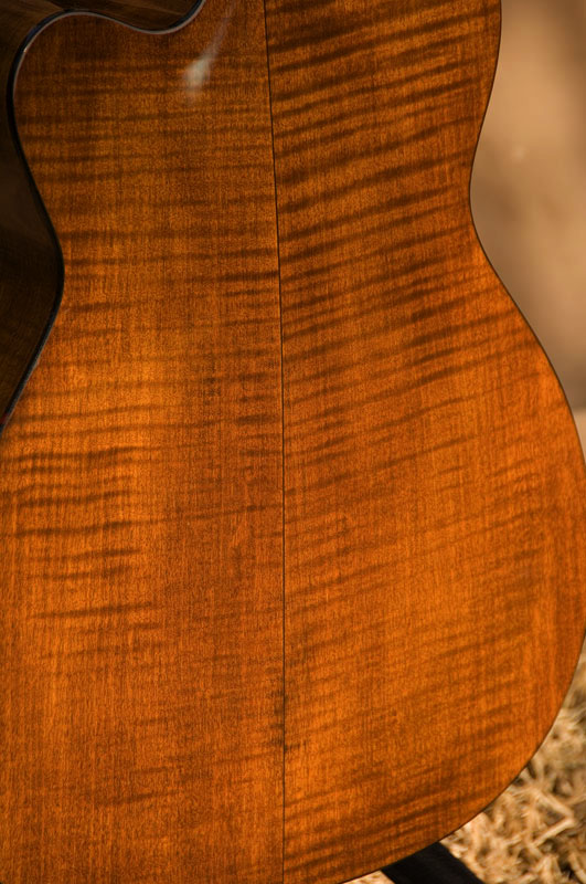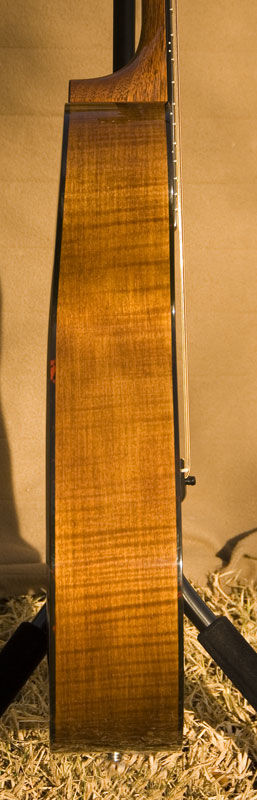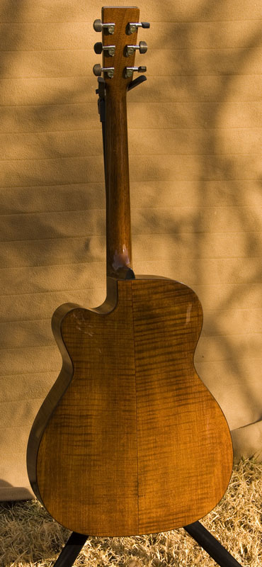 The back and sides are flame maple, stained to match the Spanish cedar neck.